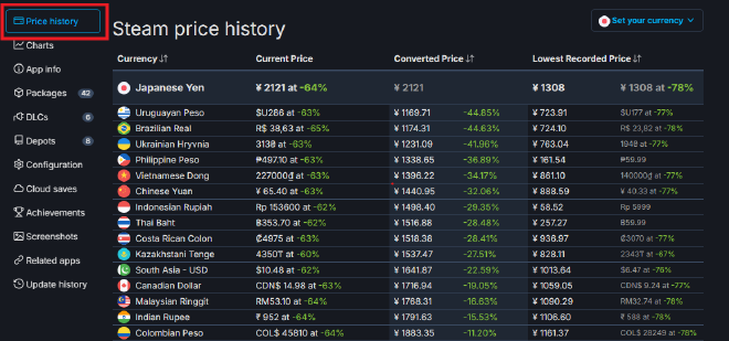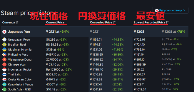 Current Price=現在価格 、Lowest Recorded Price=最安値 となっています。 また真ん中の Converted Price=円換算価格 ですが、これは外国通貨での販売価格を日本円に直した時の価格です。 画像は GTA5 の価格ですが、実は日本円での販売価格は外国と比べて割高傾向なことが分かります 😂 (例えばブラジルでは 1174 円で購入可能なのに対し、日本では 2121 円もする)。