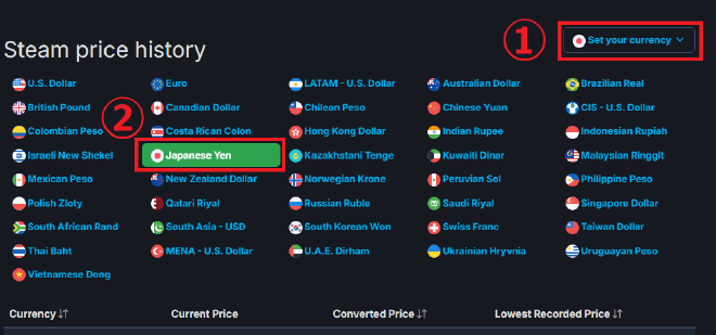 デフォルトで日本円で価格が表示されていることが多いですが、環境によっては日本円で表示されていないこともあります。 日本円表示にするには ① Set your currency から ② Japanese Yen を選択します。