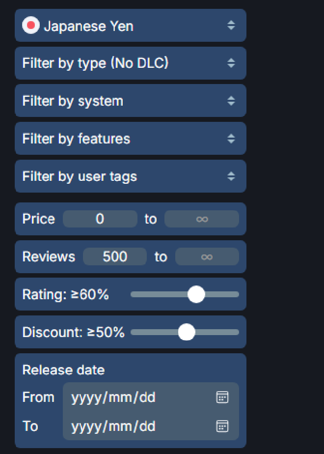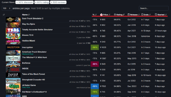 実はデフォルトの表では 「割引 50%以上」、「高評価 60%以上」、「レビュー件数 500 件以上」というフィルターがかかっており、この条件に該当するゲームのみが表示されています。 これでもいいのですが、いざ使い始めると条件を変更したくなることがあります。