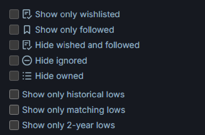 - Show only wishlisted: ウィッシュリストに入っているゲームのみ表示※