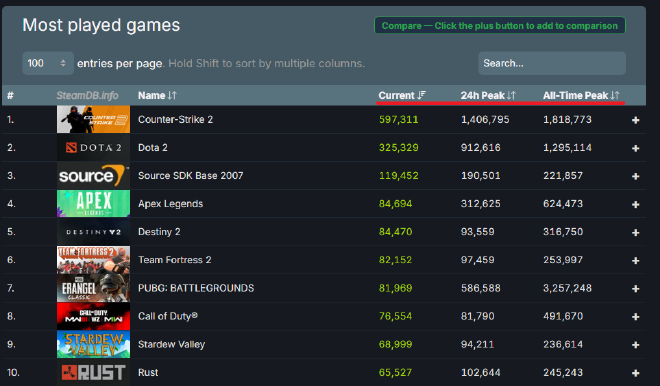昨今 YouTube や Twitch での配信が盛り上がっており、人気のあるゲームをチェックしておきたい人は多いでしょう。 SteamDB では Steam での同接ランキングを確認することができます。