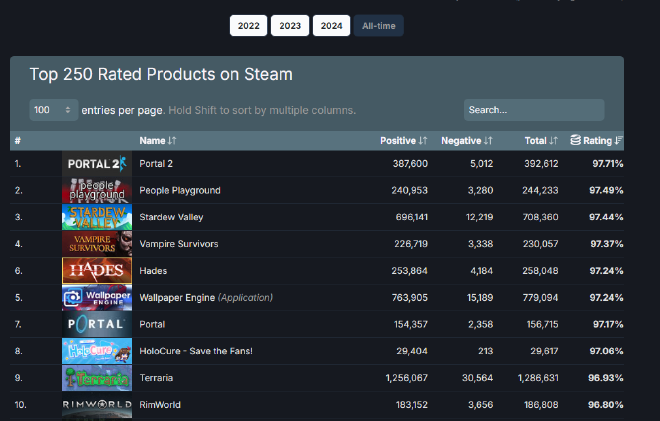 Positive (高評価数)、Negative (低評価数)、Total (トータルの評価数)、Rating (レーティング) などの項目を確認することができます。 リリース年度別にフィルターすることも可能です。